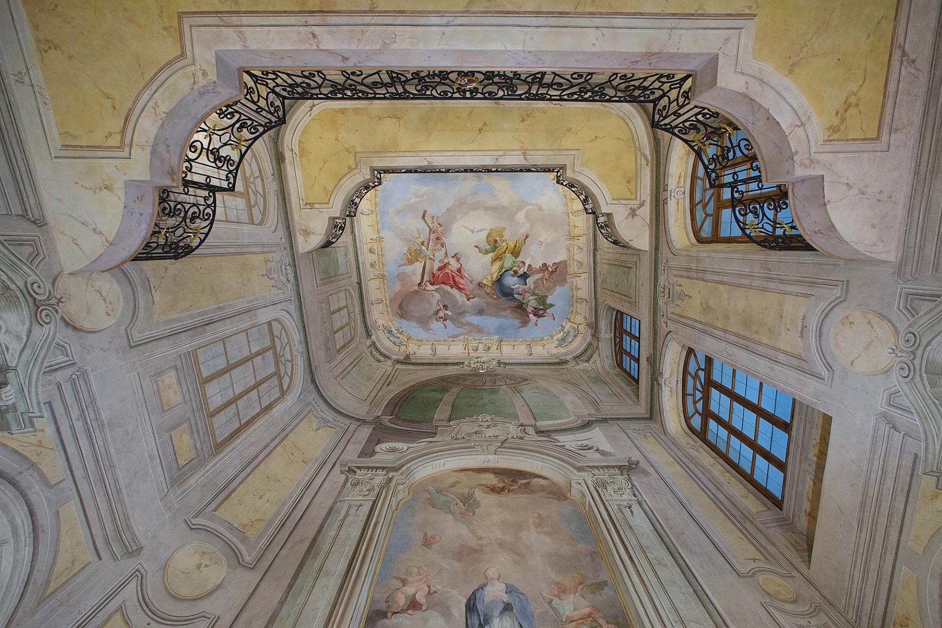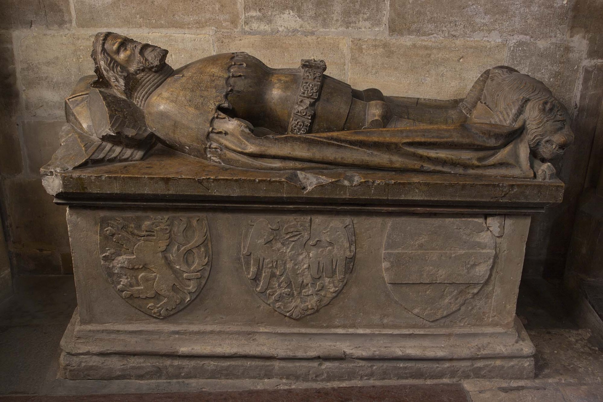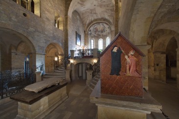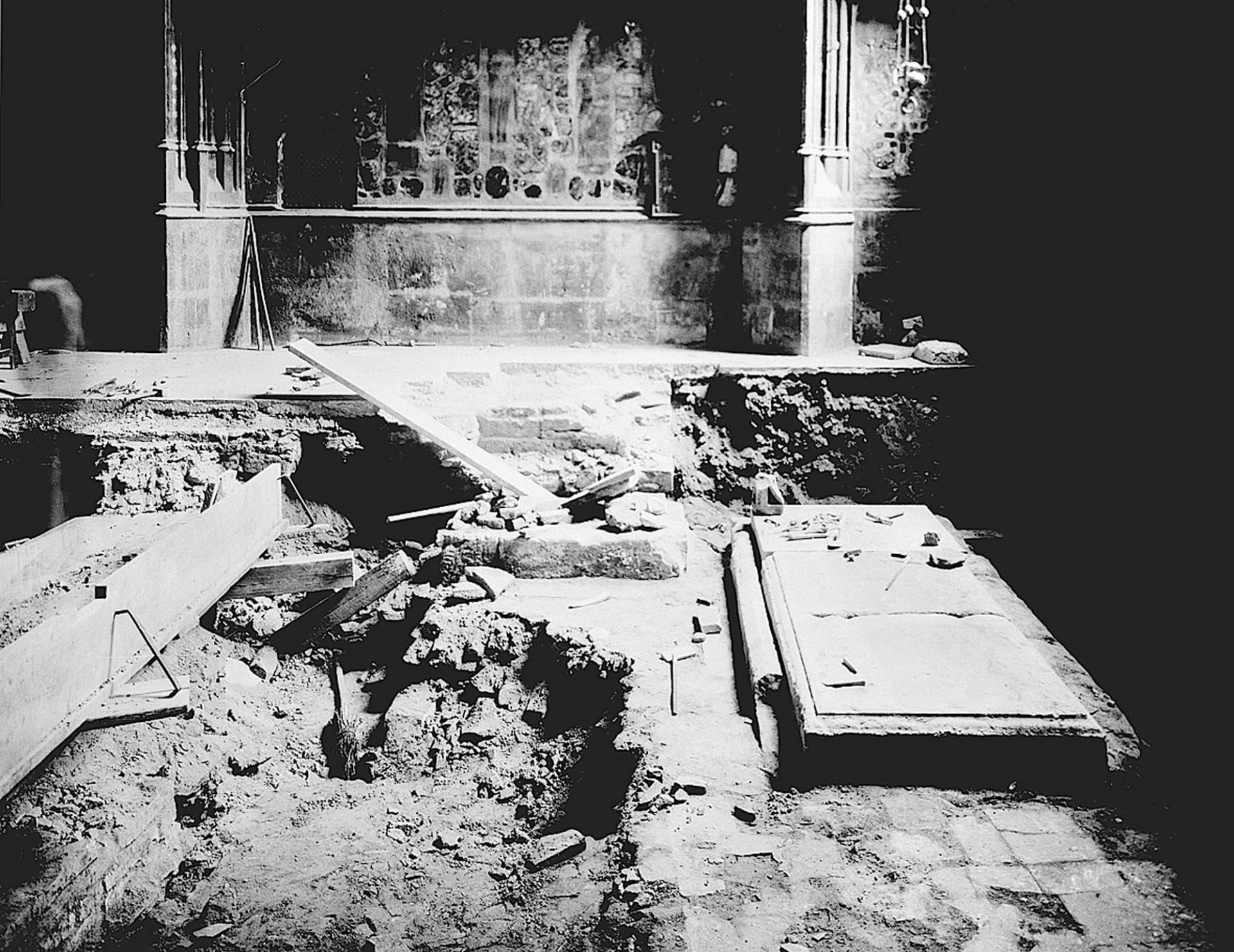 Fotografie zachycuje starou kamennou místnost s architektonickými okny a zdobenými prvky. V popředí je vykopaný prostor s archeologickými nebo stavebními materiály a kamennými deskami na zemi.