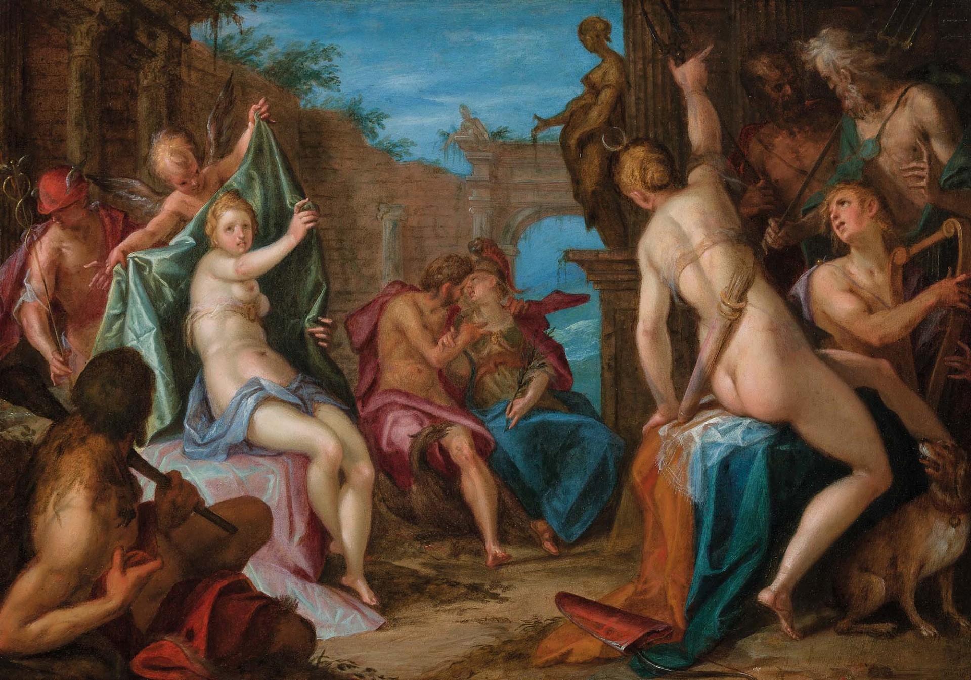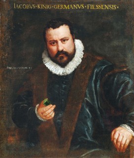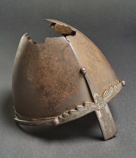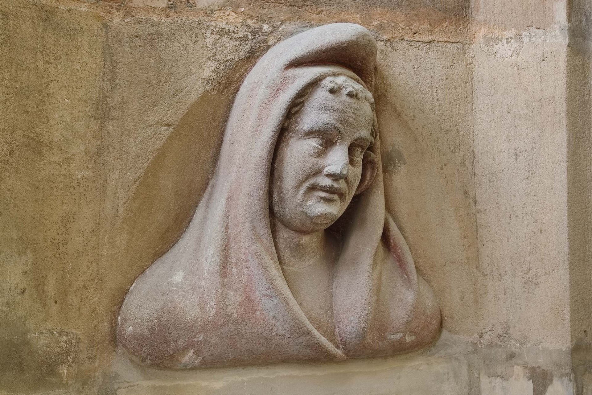 Fotografie zachycuje starou kamennou místnost s architektonickými okny a zdobenými prvky. V popředí je vykopaný prostor s archeologickými nebo stavebními materiály a kamennými deskami na zemi.