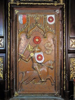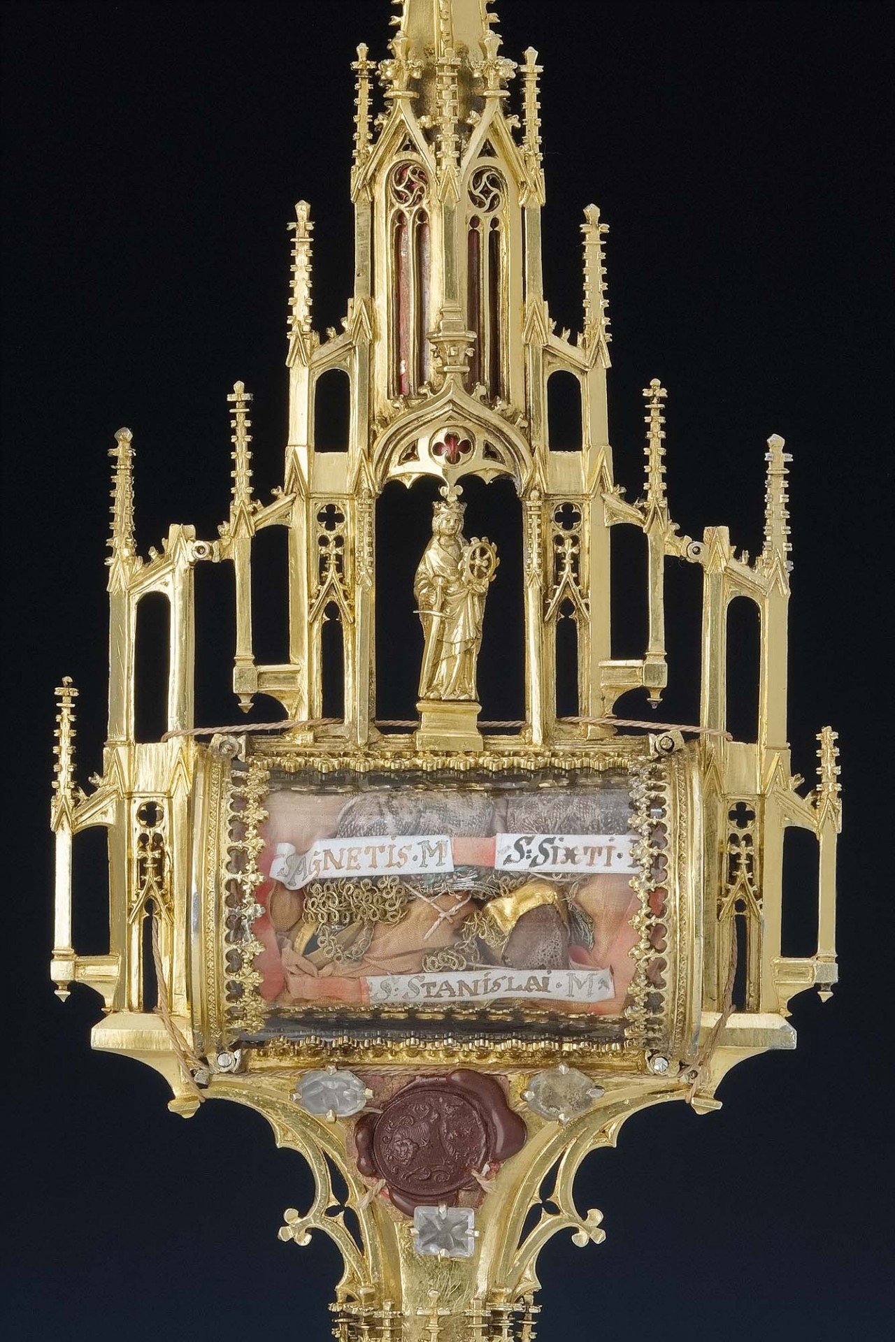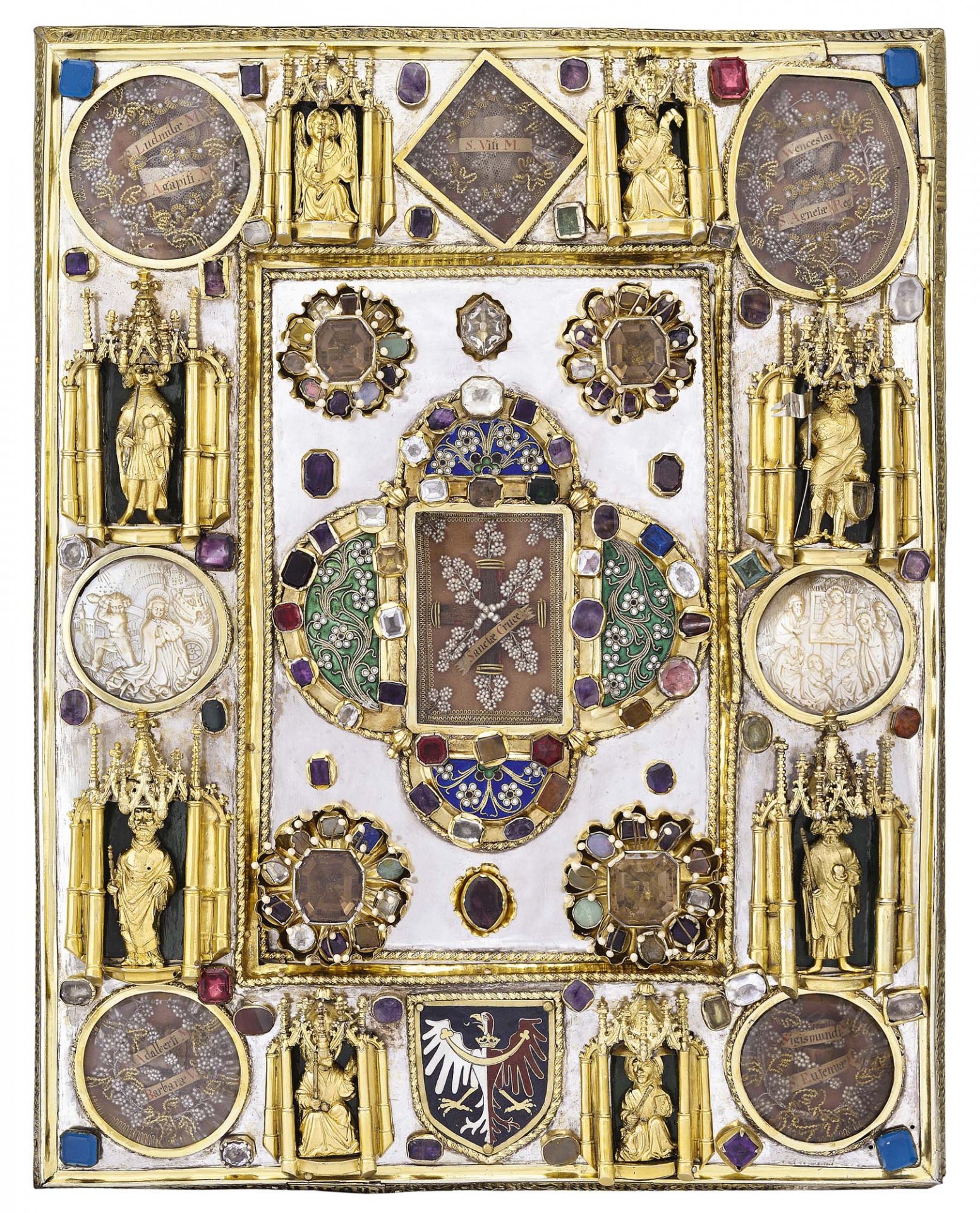 Drahokamy posázený Kolovratský plenář s relikviemi českých patronů, se dvěma částečkami ze dřeva Svatého Kříže, dílo zlatníka Martina z roku 1465.