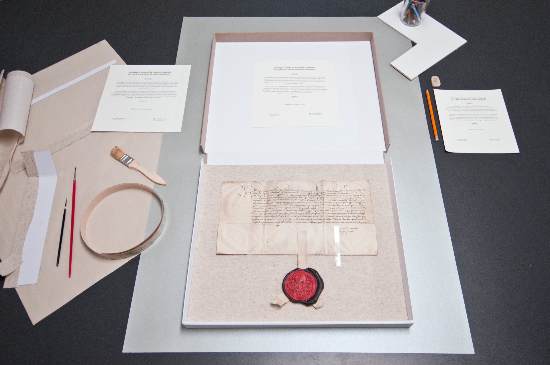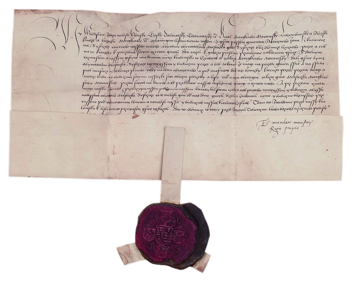 Listiny, ke kterým jsme vytvořili faksimile, jsou psané na pergamenu a za nejvýznamnější lze považovat znakové privilegium Vladislava II. Jagellonského z roku 1502, který touto listinou povolil městečku Velká Bystřice, na žádost Jana z Kunovic, užívat pečeti v zeleném vosku, na níž bude štít s rohy nahoru a obráceným půlměsícem, pod kterým jsou tři hvězdy. Jedná se o jednu z nejstarších dochovaných pergamenových listin na Moravě. V říjnu 2018 putovalo druhé faksimile této listiny do italského Alfianella.